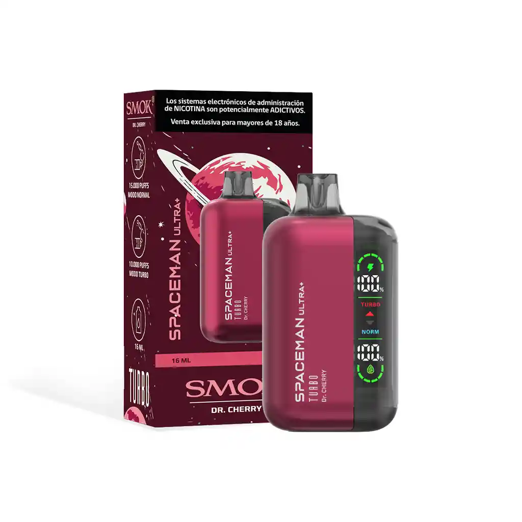 Desbloquea una experiencia más interactiva con el Vaper desechable Spaceman ULTRA+ , incorporando en su diseño una pantalla de 1.91 pulgadas, esta pantalla está dedicada a desplegar información en tiempo real del estado de batería y líquido en tu vaporizador, permitiendo también elegir entre el modo TURBO y NORMAL. Modo TURBO: Con el modo turbo puedes experimentar una calada repleta de sabor gracias a las nubes grandes de vapor que también te darán un mejor golpe de garganta. Ideal para quienes buscan un sabor más intenso y mayor vapor. Usar este modo de manera prolongada reduce la cantidad de puffs por su mayor consumo de e-liquid y batería. Modo NORMAL: Este modo te hará experimentar una sensación de vapeo suave y delicada con nubes de vapor moderadas, perfecta para quienes no quieren golpes fuertes en la garganta y buscan nubes moderadas de vapor. Este modo te dará hasta 15000 Puffs. Además incluye una batería de 800mAh ideal para asegurar una larga duración, y no te preocupes ya que es recargable mediante su puerto USB – C Tiene en su parte inferior un ajuste de aire para personalizar la calada a tus preferencias. Posee también una resistencia tipo mesh que hará cada puff una bocanada llena de sabor. DR. CHERRY: Perfecto para los antojos de los amantes del dulce, cerezas dulces.