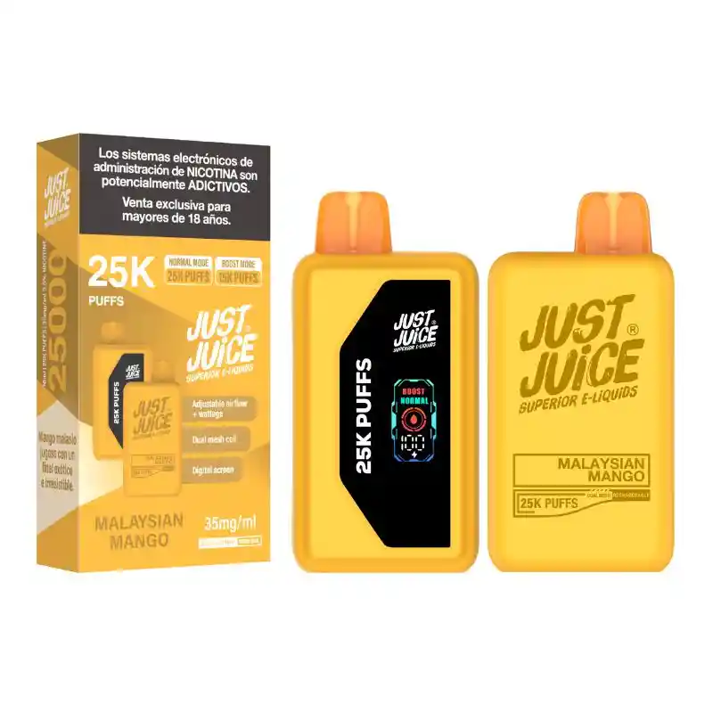 Just Juice Malaysian Mango 35mg – 25.000 Puffs Inspirado en los mangos del sudeste asiático 🥭, este sabor destaca por su dulzura intensa y aroma exótico. Malaysian Mango es ideal para los que aman los sabores frutales con cuerpo y carácter. Elige entre modo normal o boost y ajusta el aire a tu gusto. Características: Sabor: Mango dulce y tropical 🥭 Nicotina: 35mg Modos: Normal: Hasta 25.000 puffs Boost: Hasta 15.000 puffs Ajuste de flujo de aire 🔧💨 Batería: 850mAh recargable vía USB-C 🔋⚡ Marca: Just Juice Vapo desechable, sin recarga ni mantenimiento