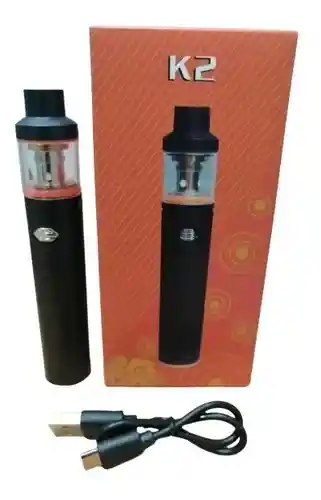 Cigarro Vaporizador K2 El Vaporizador K2 es la versión más avanzada, emitiendo luces de colores por el tanque cada vez que inhalas. Un diseño pequeño y fácil de transportar a donde quieras. K2 – Batería de 18650 mha – Único botón disparador – Rango resistencia 0.1-2.5 ohm (VW) – Tamaño pequeño y portable – Potencia <60 Watt – Dimensiones 11 x 2.6 cm , 90 gramos – Aleación de Zinc TANQUE K2 – De Acero Inoxidable – Compatible con resistencias Pen 22 – Conexión 510 – Capacidad de 22 ml – Diámetro 22mm – Ajuste de aire variable doble – Desatornillar para cargar líquido PRIMER USO VAPORIZADOR 1- Recuerda cargarlo completamente antes del primer uso. 2- Cuando ingreses el líquido por primera vez, es fundamental que lo dejes reposar al menos unos 5 minutos para que el algodón se humedezca del liquido y no obtengas una calada seca. Si no realizas este procedimiento puedes quemar el algodón de tus resistencias y luego tendrás un sabor a quemado.