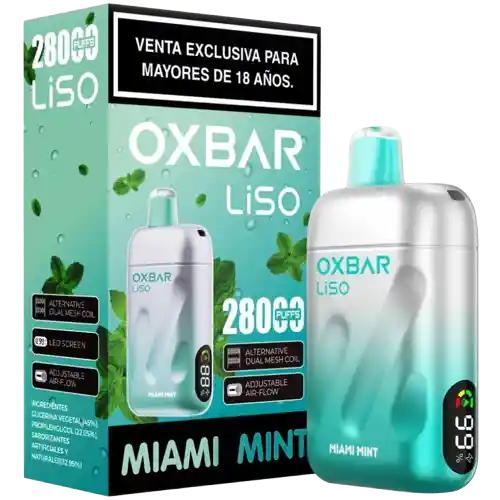 Vaporizador Oxbar Liso 28000 Puffs Miami Mint, libera un delicioso aroma a menta que deja un aire fresco y agradable en el entorno. Este vaporizador no solo ofrece un sabor refrescante, sino que también deja una fragancia ligera y envolvente. Con una excelente producción de vapor y un sabor que se mantiene firme durante toda su vida útil. Ideal para quienes buscan una sensación constante de frescura en cada inhalación.