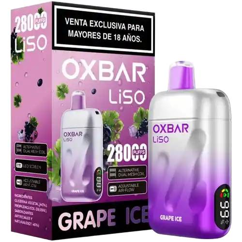 Vaporizador Oxbar Liso 28000 Puffs Grape ice, ofrece una experiencia única con su sabor intenso a uva, combinado con un toque refrescante de hielo que revitaliza en cada bocanada. Perfecto para quienes buscan una mezcla de dulzura y frescura. Este vaporizador desechable está diseñado para ofrecer hasta 28,000 inhalaciones, asegurando un uso prolongado sin perder la calidad del sabor.