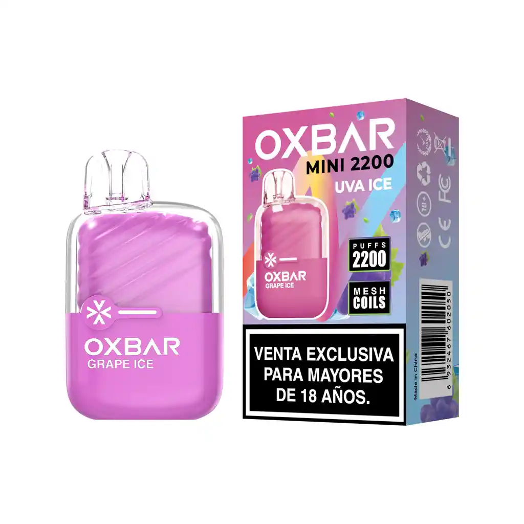 Oxbar Mini 2200 Puffs Grape Ice, frescura a un precio inigualable. Este dispositivo tiene una capacidad de 5 ml, una potencia del 5%, una batería de 600 mAh (no recargable), y una resistencia de 1.2 ohm con Mesh Coil.
