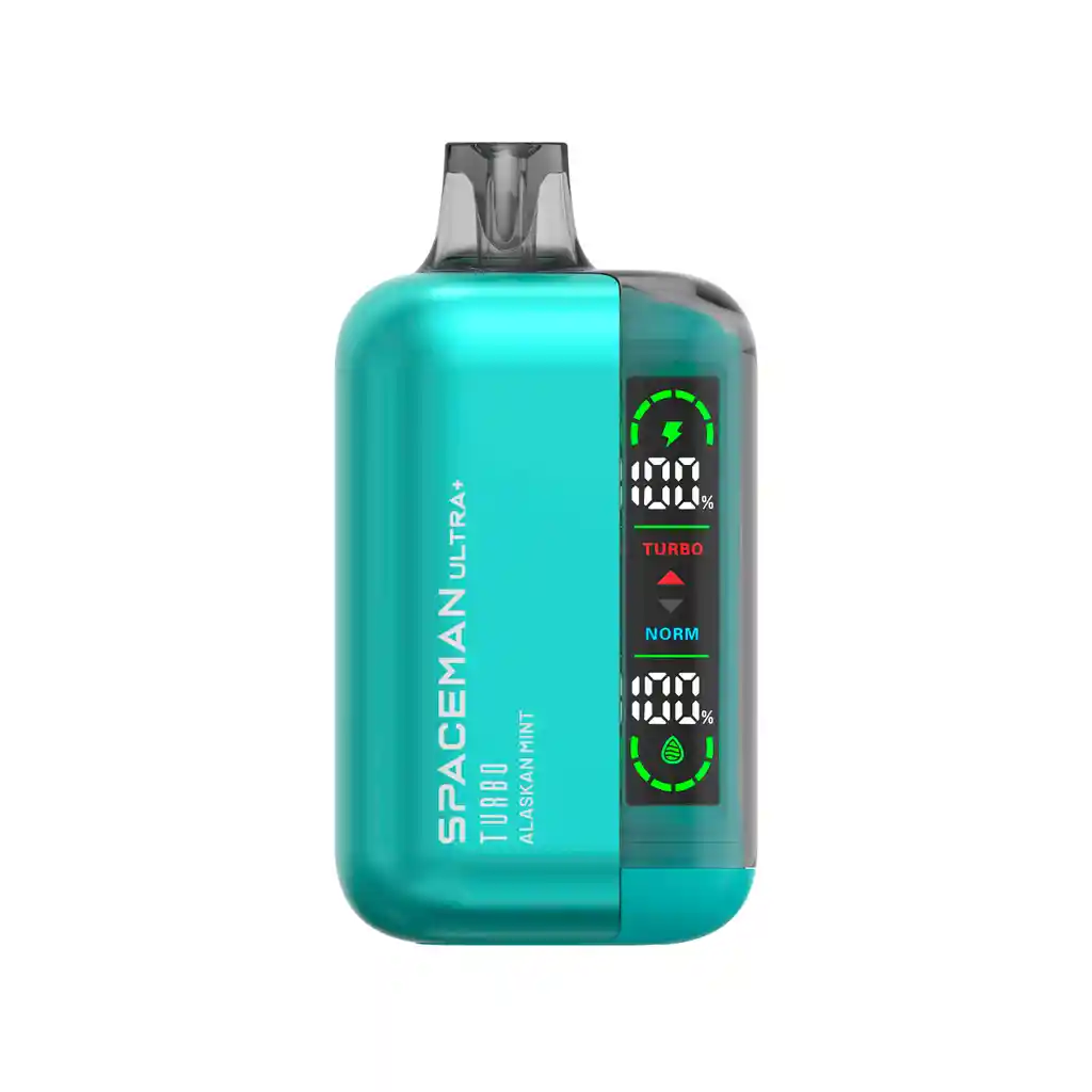 Spaceman ULTRA+ Vaporizador con pantalla de 1.91" que muestra batería y nivel de líquido en tiempo real. Ofrece dos modos: TURBO para nubes grandes y sabor intenso, y NORMAL para una calada suave y hasta 15.000 puffs. Batería de 800mAh recargable por USB-C, con ajuste de aire y resistencia mesh para máximo sabor.