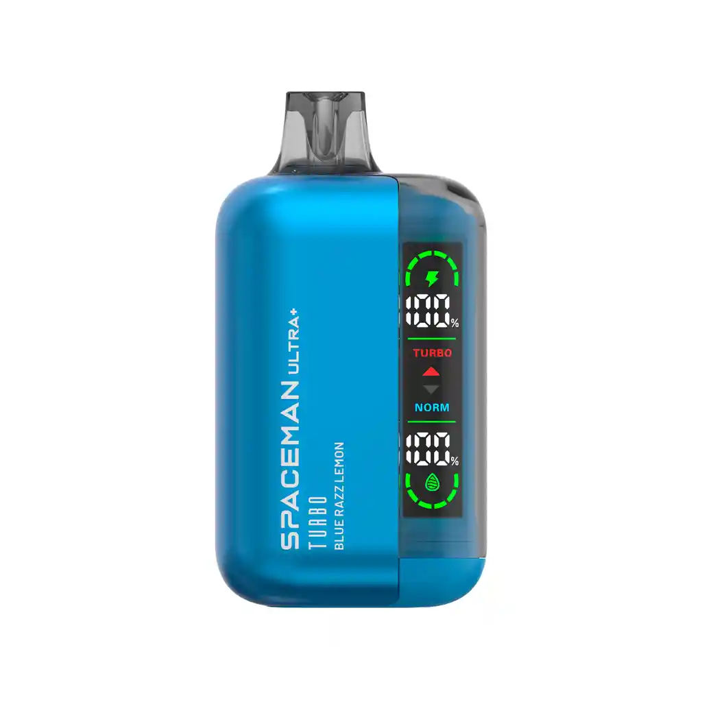 Spaceman ULTRA+ Vaporizador con pantalla de 1.91" que muestra batería y nivel de líquido en tiempo real. Ofrece dos modos: TURBO para nubes grandes y sabor intenso, y NORMAL para una calada suave y hasta 15.000 puffs. Batería de 800mAh recargable por USB-C, con ajuste de aire y resistencia mesh para máximo sabor.
