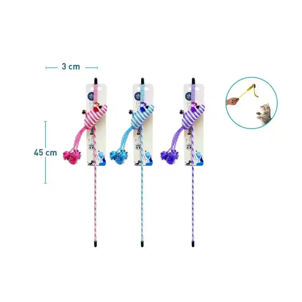 La varita de juego con ratón para gatos es un juguete interactivo ideal para estimular el instinto de caza y mantener a tu gato activo y entretenido. Su diseño permite un juego dinámico, favoreciendo el ejercicio diario y reduciendo el aburrimiento. Cuenta con una vara liviana y un ratón de tela con cuerdas, que atrae la atención del gato y lo motiva a perseguir, saltar y atrapar. Es perfecta para fortalecer el vínculo entre la mascota y su tutor a través del juego. Un accesorio simple y efectivo para promover la actividad física y el bienestar de tu gato. 📏 Medidas Largo total: 45 cm Ancho aproximado del accesorio: 3 cm ✅ Características Varita de juego interactiva Incluye ratón de tela con cuerdas Liviana y fácil de manejar Estimula el instinto de caza Favorece el ejercicio diario Ideal para juego supervisado Apta para gatos de todas las edades 🎨 Colores Disponible en variedad de colores y diseños. 👉 Los colores se envían según disponibilidad en tienda.