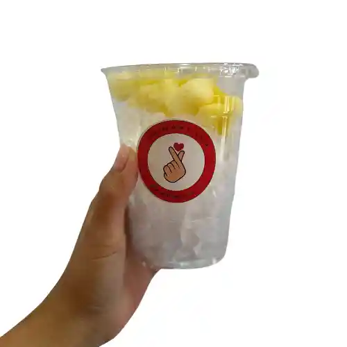 VASO DESCARTABLE CON HIELO Y TROZOS DE PIÑA CONGELADA. ABRIR Y SERVIR BEBIDA DESEADA.