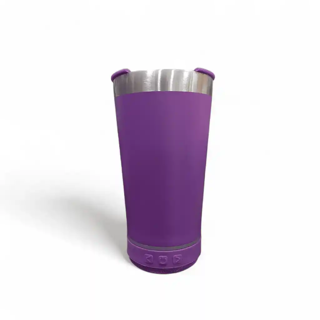 Vaso térmico multifunción de color morado con parlante Bluetooth integrado y luces LED. Mantiene líquidos fríos o calientes y tiene capacidad de 473 ml. Perfecto para uso diario, oficina o actividades al aire libre.