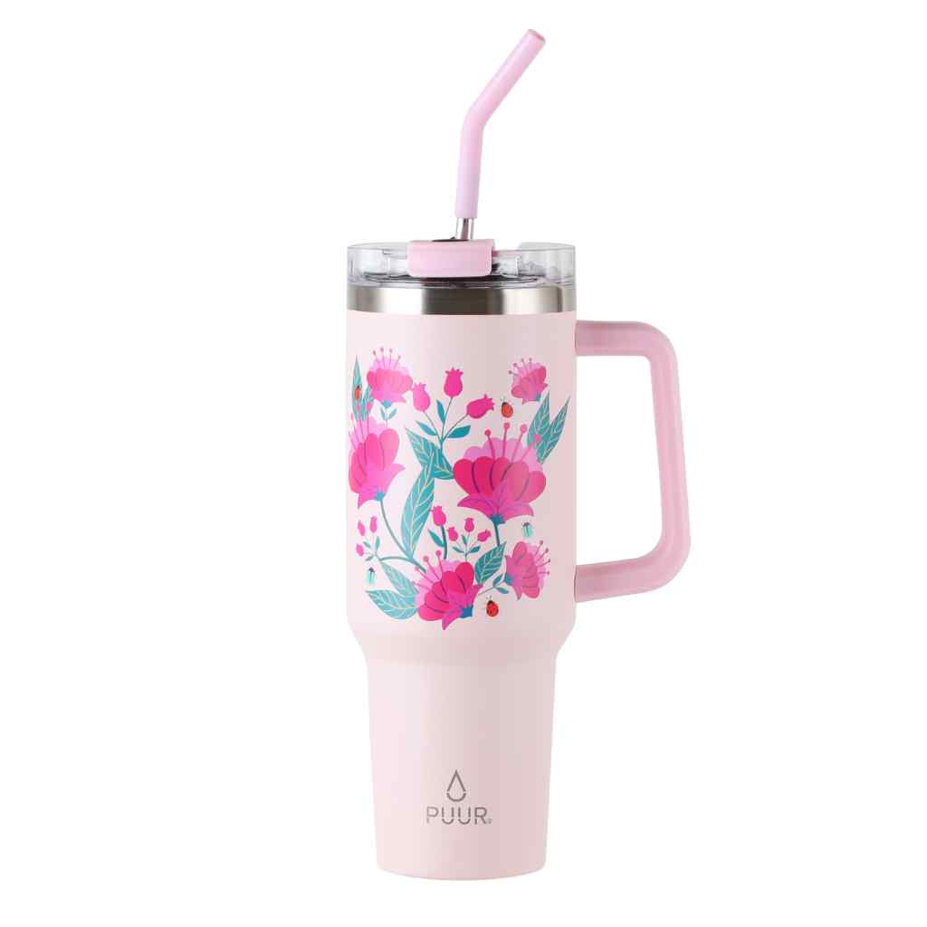 El Puur Mug Ladybug de 1200 ml., es parte de la nueva colección de Puur. Sus pequeña chinitas mezcladas con exóticas flores le entregan un toque de dulzura. Este quencher de color rosa logra destacar el gran talento que hay detrás de cada diseño.Disfrutar de tus bebidas favoritas y estar siempre acompañada con tu mug con estilo y diseño, es el complemento perfecto para tu look. El tamaño es perfecto para la mayoría de los portavasos estándar de los autos y viene con un mango resistente para transportarlo.La tapa es giratoria con tres posiciones: una abertura para bombilla, una boca ancha para beber y una parte superior que cubre todo el vaso para evitar derrames. Incluye una bombilla de acero inoxidable con boquilla de silicona.El Puur Mug Ladybug de 1200 ml está fabricado con una doble pared de acero inoxidable y una capa de cobre en su interior, permitiendo que se mantenga la temperatura de los líquidos fríos por 12 horas y caliente por 6 horas.Es 100% reutilizable, libre de BPA y funcional.