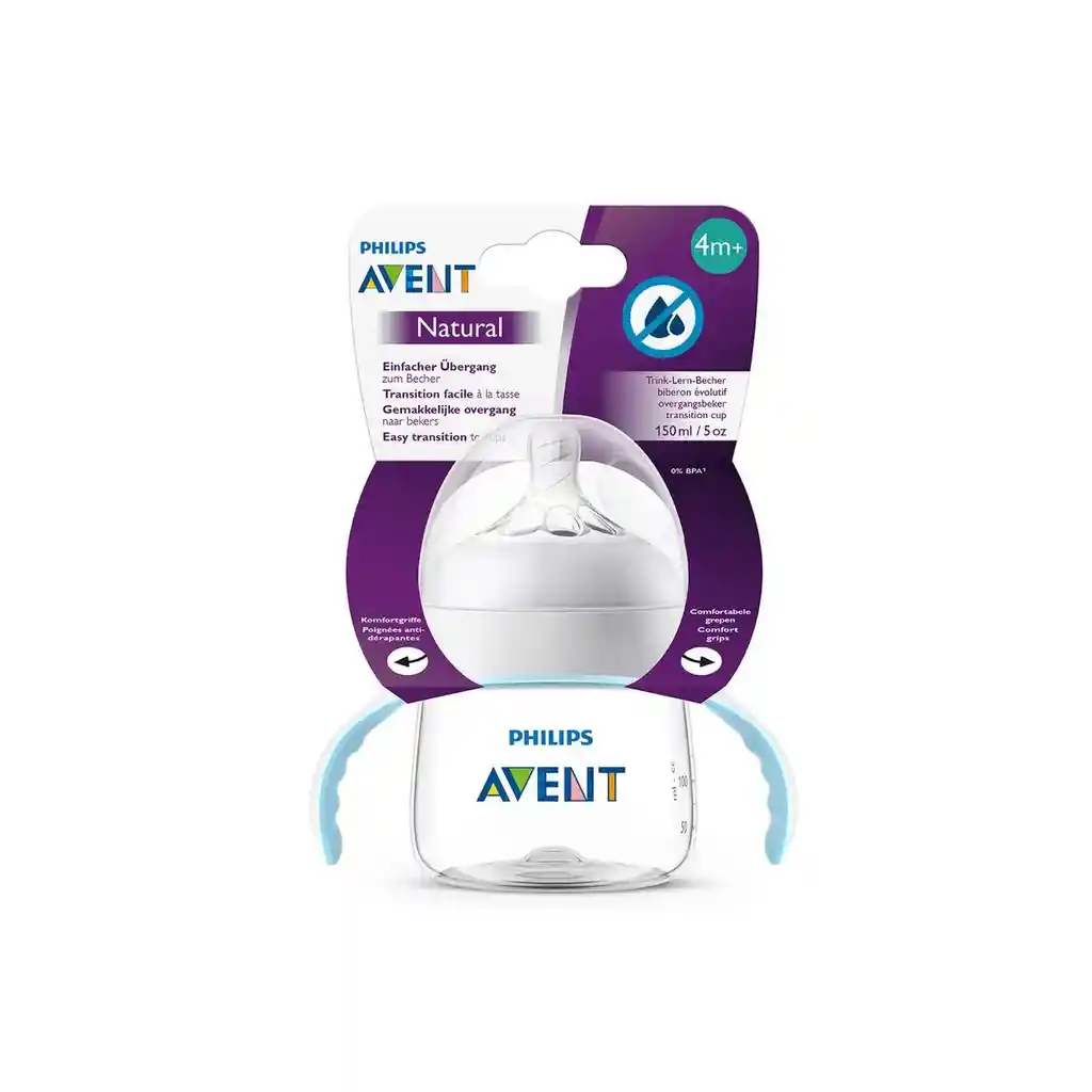 Con el práctico Vaso Trainer Cup Natural Avent, ¡tu bebé tendrá una transición fácil, cómoda y segura desde la mamadera al vasito de entrenamiento!. ¿Lo mejor? Sus prácticos mangos de entrenamiento ayudan a los niños pequeños a sujetarlo y beber de forma independiente. Estos mangos tienen una forma pensada en las manos pequeñas y están engomados para entregar una sujeción antideslizante y mucho más segura. Características: Sujeción natural: La tetina ancha con forma de pecho permite un ajuste natural, parecido al del pecho, lo que le permite al bebé combinar la lactancia materna y la alimentación con mamadera. La tetina cuenta con una textura ultra suave diseñada para imitar la sensación del pecho. La válvula anticólico se diseñó para expulsar el aire de la pancita del bebé y para ayudar a reducir la incomodidad y los cólicos. Diseño ergonómico: Gracias a su exclusiva forma, la mamadera es fácil de sostener y sujetar en cualquier dirección para obtener una comodidad máxima, incluso con las diminutas manos del bebé. Fácil de usar y limpiar: El cuello ancho de la mamadera permite un llenado y limpieza fáciles. El armado es rápido y sencillo, ya que son pocas piezas. Compatibilidad en toda la línea: Mezcle y combine el extractor de leche, la mamadera y las piezas del vaso, y cree su producto ideal cuando lo necesite. Asas de entrenamiento con tacto suave para pequeñas manos: Los mangos de entrenamiento ayudan a los niños pequeños a sujetar el vaso y beber de forma independiente. Estos mangos tienen una forma fácil de sujetar para sus pequeñas manos y también están engomados para entregar una sujeción antideslizante. La mamadera Natural de Philips Avent está fabricada con material libre de BPA* (polipropileno). Edad recomendad: 6 Meses +. Capacidad: 150 ml.
