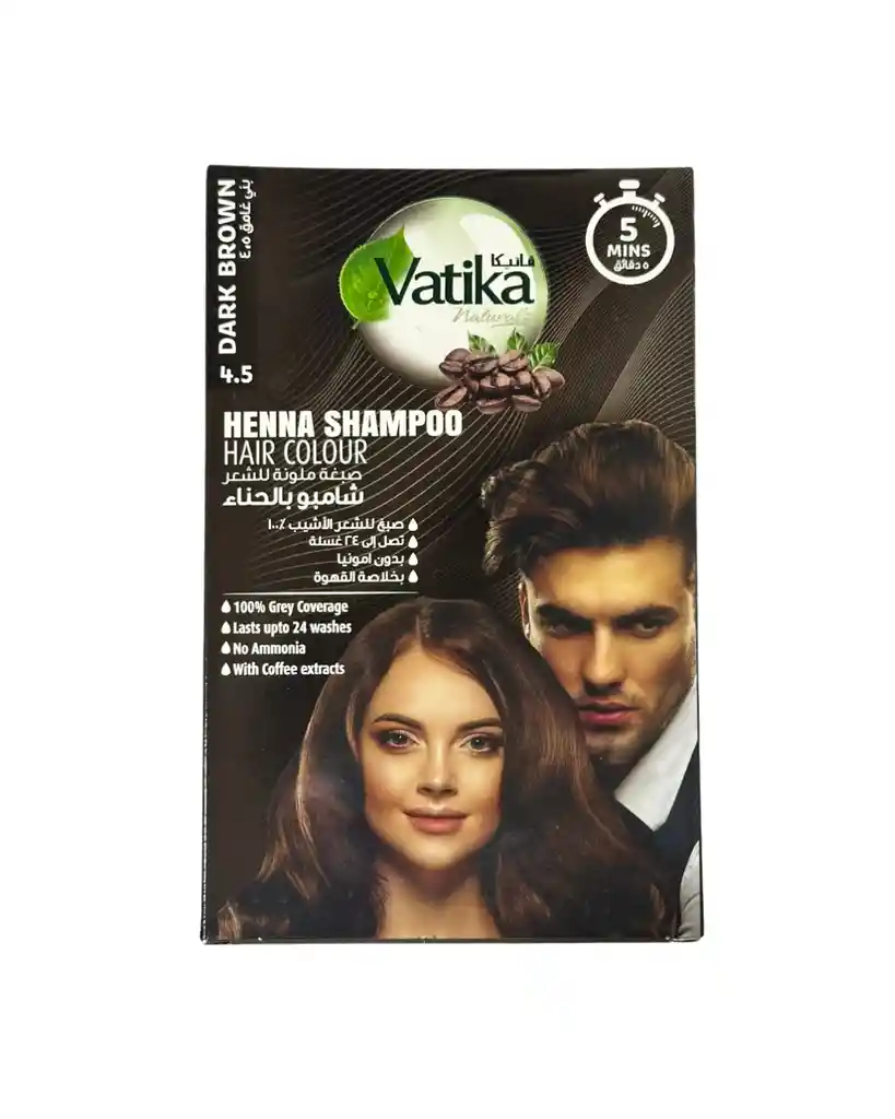 ¡Disfruta de la lujosa transformación de tu cabello en casa con Vatika Naturals Henna Shampoo Hair Color en solo 5 minutos! Enriquecida con vigorizantes extractos de café, nuestra fórmula no solo brinda un tono marrón oscuro impresionante y natural, sino que también brinda nutrición intensiva, dejando tu cabello irresistiblemente suave y manejable. La mezcla 100 % libre de amoníaco garantiza un proceso de coloración suave que cubre el 100 % del cabello gris y blanco a la perfección, realzando la auténtica belleza de tu cabello. Deléitese con la vitalidad que dura hasta 24 lavados, a medida que la fórmula penetra en cada mechón, creando un acabado marrón oscuro cautivador y duradero. ¡Experimente la combinación perfecta de naturaleza y color, revelando un cabello más sano, revitalizado y elegantemente teñido! Descubra su combinación perfecta de color instantáneo para el cabello, también disponible en color negro natural enriquecido con extractos de semillas negras. ¡Sin Amoníaco!