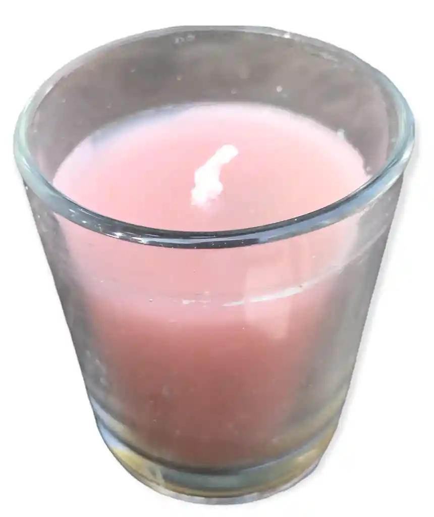 Vela vaso vidrio color Rosa Viejo Poder de dinero Ideal para espacios interiores o exteriores 6 x 5 cm Modelo único por unidad (1 Unidad)