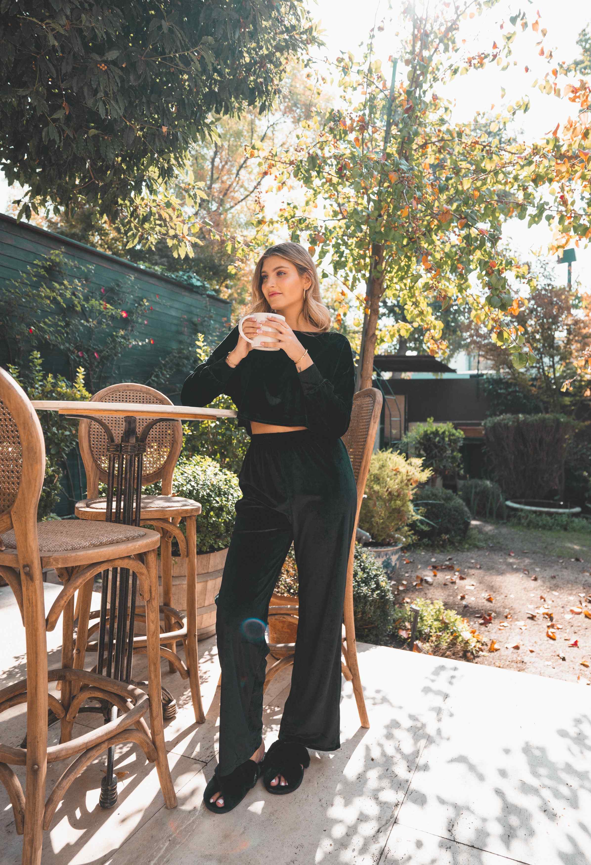 Pijama invierno en terciopelo negro. No tiene botones, tela elastica. Top corto, pero pantalon tiene pretina alta. Incluye scrunchie de regalo.