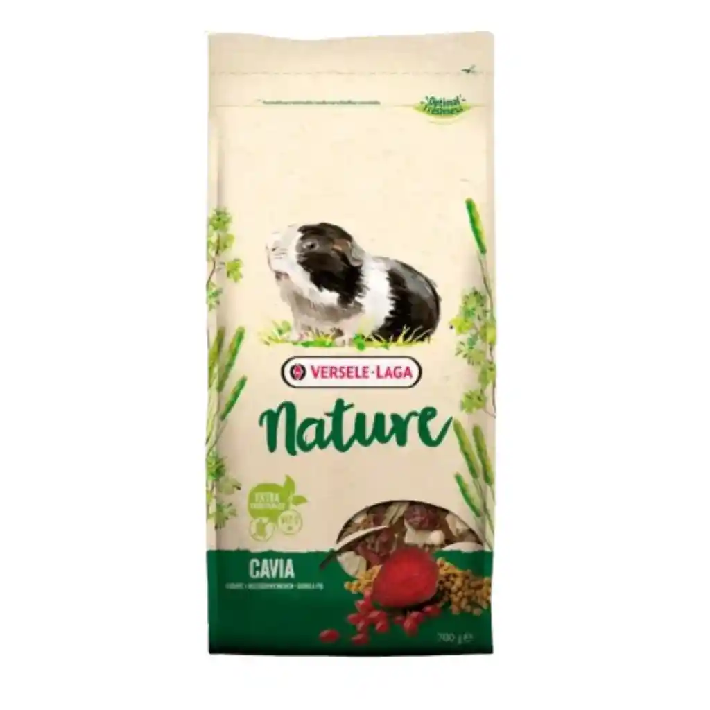 Versele-Laga Nature Cobaya comida completa sin cereales para cobayas, combinación de hierbas y plantas aromáticas, con vitaminas y minerales esenciales, dosis extra de vitamina C para estimular el sistema inmunitario. Versele-Laga Nature Cobaya es un alimento de calidad, adaptado a las necesidades nutricionales de las cobayas. Su fórmula está elaborada con diversas verduras sabrosas, por lo que además de ser muy rico en fibra, posee un sabor irresistible. Al no contener cereales, resulta especialmente fácil de digerir y ayuda a equilibrar la flora intestinal. Gracias a su contenido extra de vitamina C y minerales se pueden fortalecer las defensas y apoyar el sistema inmunitario del roedor. De esta manera se sientan las bases para que el animal disfrute de una vida sana y feliz. La remolacha, los guisantes amarillos y los escaramujos jugosos aportan un sabor que enamorará a todo roedor. ¡Regala salud y sabor a tu pequeña mascota con Nature Cavia! Ingredientes Subproductos vegetales (timoteo, prado y hierbas 21 %). Verduras (remolacha 5,5 %, guisantes amarillos 4 %, guisantes verdes 12 %). Frutas (escaramujo 1 %). Semillas. Minerales. Extracto de proteínas vegetales. FOS. Caléndula. MOS. Algas. Yuca.