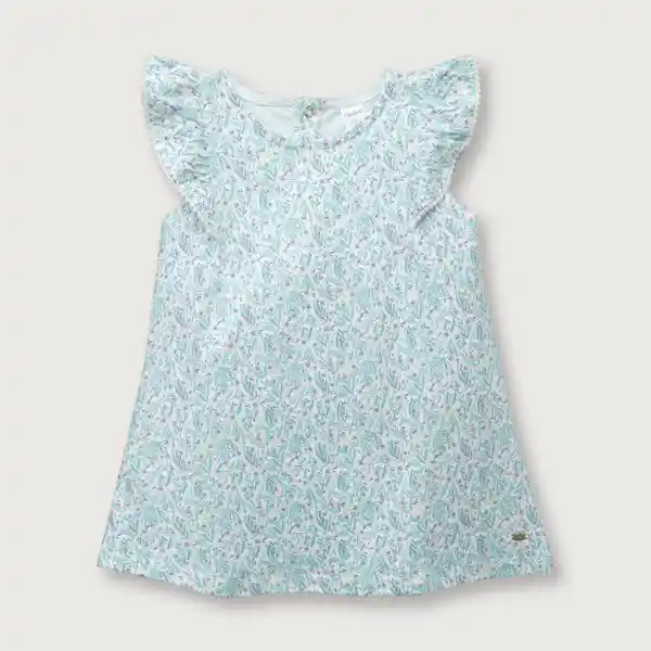 De Color Blanco Con Estampado de Frutillas en Tonos Verde Agua Denim y Rosado Manga Alita Pequeña Con Pasamanería en Los Bordes y Abertura en la Espalda Con Broches a Presion.