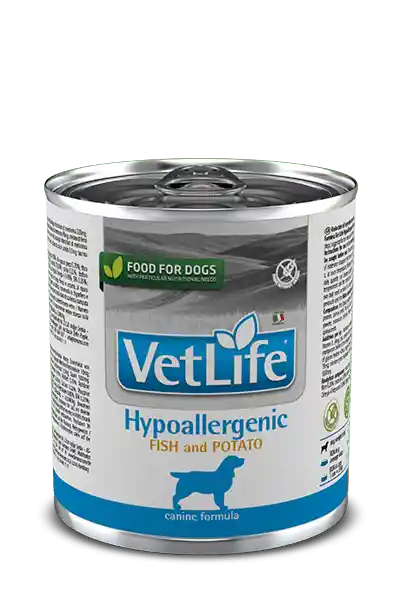 Reducción de la aparición de reacciones adversas a los alimentos. Farmina Vet Life Hypoallergenic Fish Potato es un alimento dietético completo formulado para la reducción de la intolerancia alimentaria en perros. También se recomienda como coadyuvante en el soporte de la función trófica de la piel y de sus apéndices: ojos, oídos, sacos anales. COMPOSICIÓN Pescado (trucha, sardinas) (28%), batata (12%), proteína de pescado hidrolizada, extractos de semillas de quinoa, aceite de pescado, carbonato de calcio, fosfato dicálcico, celulosa en polvo, cloruro de potasio. Fuente de proteínas: pescado. Fuente de hidratos de carbono: batata. CONTIENE: 300g