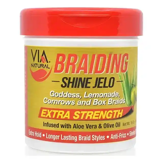 Via Natural Braiding Shine Jelo Extra Strength – Gel fijador especialmente formulado para trenzas como box braids, cornrows, goddess braids y estilos similares. Proporciona fijación extra fuerte que ayuda a mantener el peinado por más tiempo, controla el frizz y aporta brillo al cabello. Enriquecido con aloe vera y aceite de oliva, ayuda a mantener el cabello hidratado y con apariencia saludable sin dejar residuos visibles. Contenido: 454 g (16 oz). Uso externo.