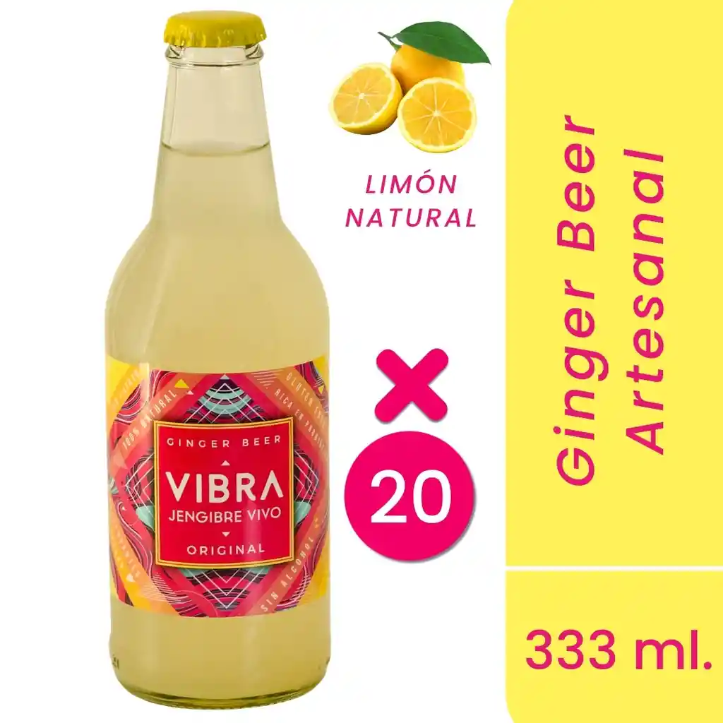 Vibra Original Limón / Caja 20 und. x 333 ml. Vibra es una Ginger Beer Premium hecha en Chile. Elaborada artesanalmente en pequeños lotes con jengibre fresco y jugo natural de limón. Con finas burbujas naturales producto de su fermentación y rica en probióticos. Vegana, sin gluten, baja en azúcar. Fresca, cítrica y un leve picor del jengibre. Perfecta para cocteles o tomar algo rico y sano cualquier momento. Botella de vidrio 333 ml.