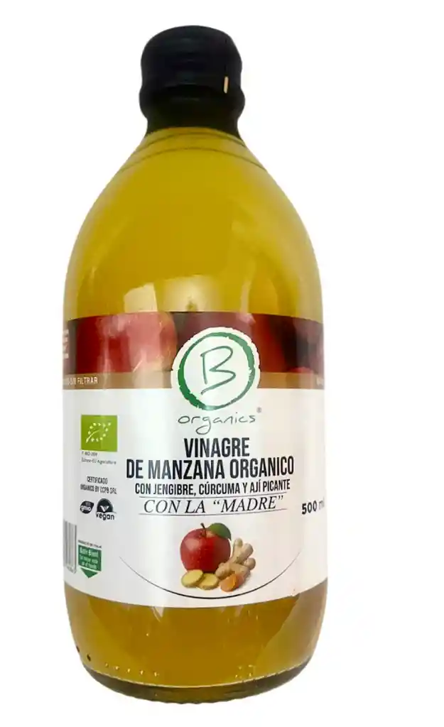 Vinagre de Manzana Orgánico con Jengibre, Cúrcuma y Ají (500 ml) Una mezcla poderosa y 100% orgánica que activa cuerpo y mente. El vinagre de manzana se combina con jengibre y cúrcuma —conocidos por sus efectos antiinflamatorios y digestivos— y un toque suave de ají picante, que estimula el metabolismo sin ser invasivo. Ideal como tónico matutino o para usar en jugos y aderezos. ¡Sabor equilibrado, beneficios reales!