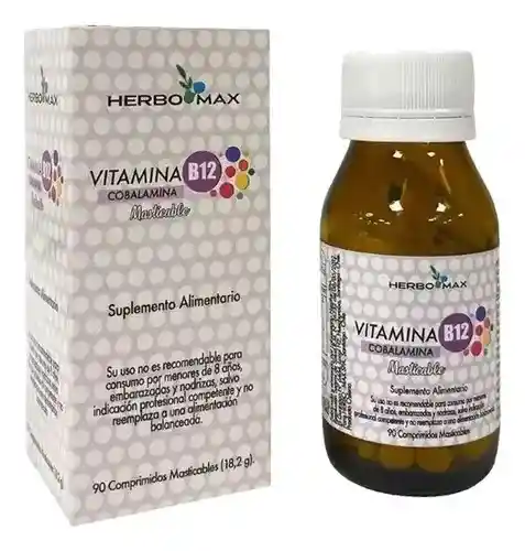 Vitamina B12 Cobalamina Masticable de Herbo Max es un suplemento de vitamina B12 en formato masticable de agradable sabor a frutos rojos. Cada comprimido aporta 1000 mcg de vitamina B12 en forma de cianocobalamina, ideal para quienes buscan una alternativa a las cápsulas tradicionales. Beneficios: • Aporte de energía: La vitamina B12 es esencial para el metabolismo energético, ayudando a combatir la fatiga y el cansancio. • Formación de glóbulos rojos: Participa en la síntesis de glóbulos rojos, previniendo la anemia megaloblástica. • Función neurológica: Es fundamental para el buen funcionamiento del sistema nervioso, mejorando la memoria, la concentración y el estado de ánimo. • Salud cardiovascular: Reduce los niveles de homocisteína, un aminoácido que puede aumentar el riesgo de enfermedades cardiovasculares. • Sistema digestivo: Favorece la absorción de nutrientes y la digestión. • Salud mental: Puede ayudar a mejorar la salud mental, combatiendo la depresión y la ansiedad.