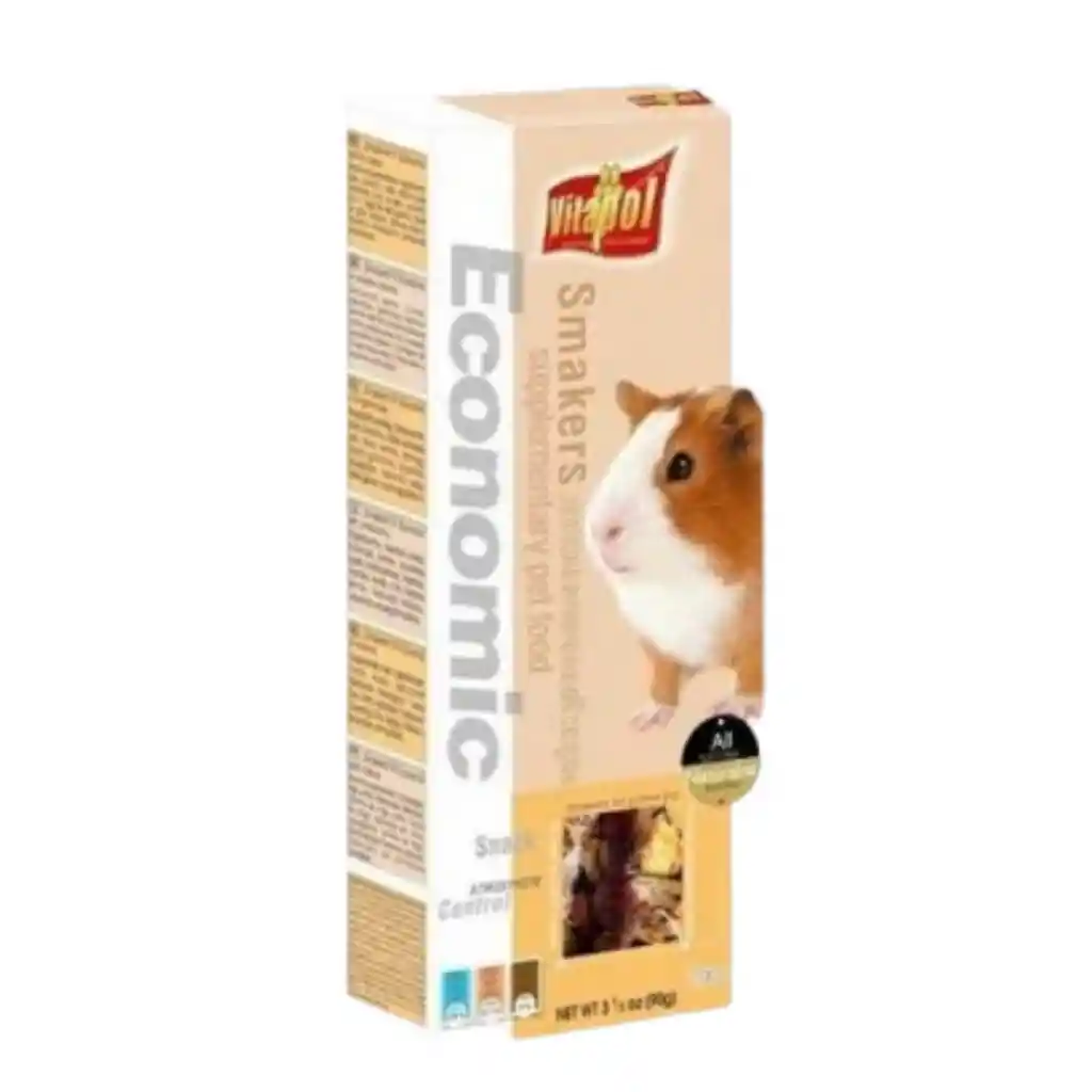 Vitapol Smakers Cobaya son dos deliciosas barras de madera cubiertas con cereales para tu Cobaya que le dará entretención entre comidas además de ayudar en el desgaste dental y pelaje saludable. Los copos de trigo facilitan y mejoran la digestión. Las lilas negras son excelentes antioxidantes. También son una fuente de vitaminas A, B1, B2, C y carotenoides y yodo. Han sido fabricados cumpliendo altos estándares de calidad y bajo una atmósfera controlada, evitando los conservantes, pero asegurando la duración del producto tanto en calidad como sabor. Las frutas y verduras son deshidratadas especialmente a baja temperatura para mantener sus propiedades como vitaminas y minerales. En cada envase vienen dos barras con un colgante para colocar en el hábitat de tu Cobaya . Ingredientes Trigo, maíz, remolacha deshidratada, avena mondada, copos de trigo, semillas de lino, baya del sauco, harina de trigo