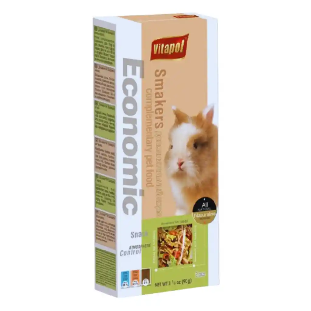Vitapol Economic Smakers Conejo son unas deliciosas barras de madera cubiertas con cereales, que le dará entretención entre comidas además de ayudar en el desgaste dental, brinda un pelaje saludable y complementa su dieta diaria. Ingredientes: trigo, copos de trigo, zanahoria deshidratada, manzana deshidratada, copos de guisantes, semillas de lina, harina de trigo. Los copos de trigo con alto contenido de fibra aseguran una digestión adecuada, también las zanahorias y las manzanas proporcionarán vitaminas y minerales esenciales. Posee ingredientes 100% naturales. Los guisantes se asegurarán de que la dieta no carezca de la proteína completa necesaria para el desarrollo adecuado y el buen estado del conejo.