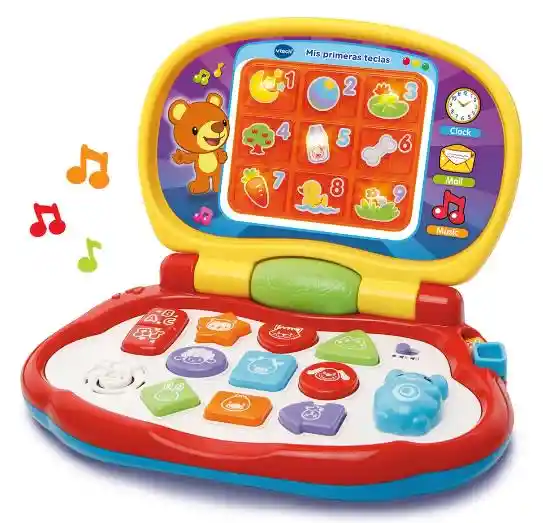 Divertido miniordenador infantil con 3 modos de juego. Enseña animales, formas, notas musicales y colores. Contiene 9 botones de formas/animales, un botón de ABC y un ratón con 8 direcciones, 9 LEDs y tapa como un portátil, más de 115, canciones, melodías, sonidos y frases. Medidas del producto (Alto x Ancho x Fondo) 32.2 x 28.2 x 6.6 cm. Funciona con 2 pilas AA incluidas.