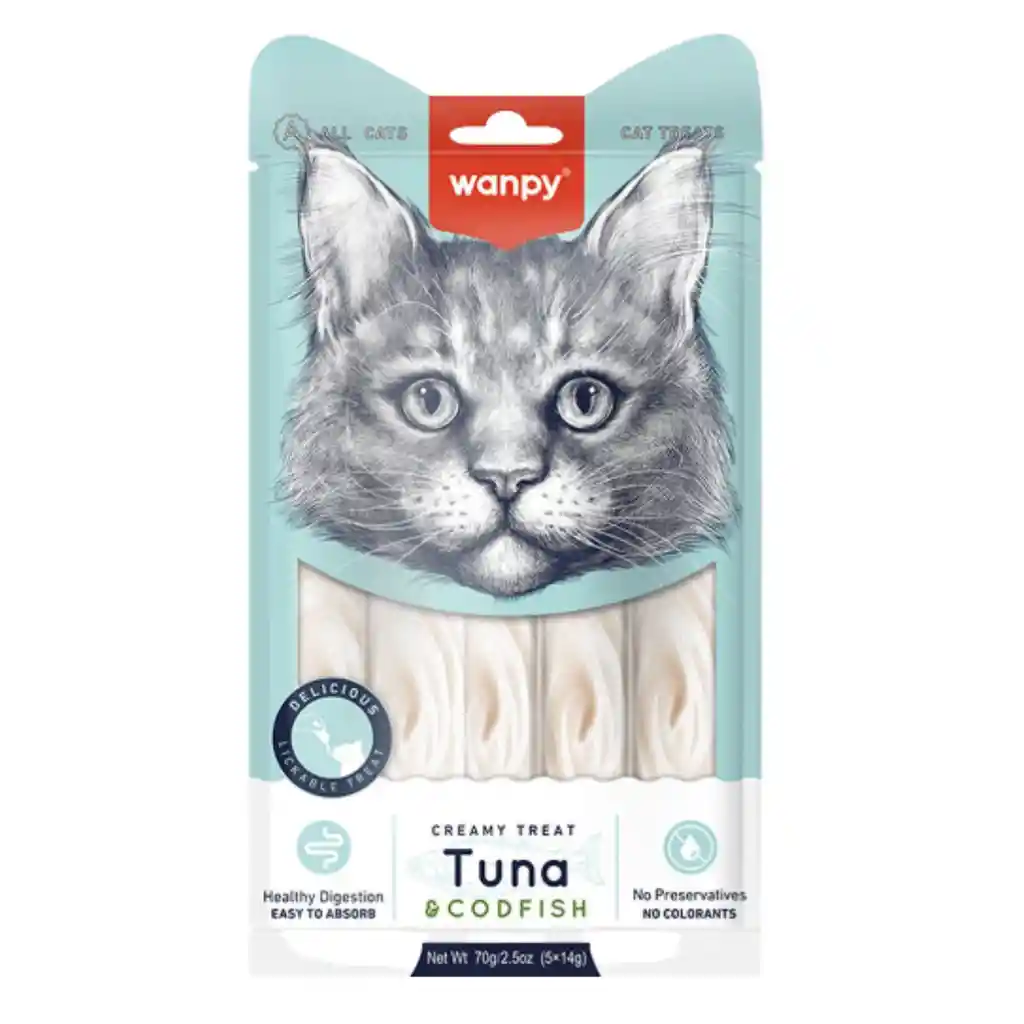 Snack para gatos, libre de granos, en pasta de filete de atún y bacalao Ingredientes: Filete de atún, filete de bacalao, pechuga de pollo, almidón, taurina, polifenoles de té, celulosa, oligosacáridos, vitaminas (A, B2, B3, B5, D3, E), goma xantana. Sin preservantes ni colorantes. Libre de granos, soya y gluten. Características: - Snack para gatos con textura cremosa sabor a atún y ostiones. - Destinado para gatos de más de 3 meses de edad. - Ha sido elaborado con los mejores ingredientes, sin cereales ni conservantes, y con un sabor inigualable que le encantará a tu gato. - Es de saludable digestión (fácil absorción) - No contiene preservantes ni colorantes. - Libre de granos, soya y gluten. - Puede ser administrado como premio entre comidas. - Cada envase de Wanpy Creamy tiene 5 tubos sellados. (14g). Abre un tubo y lo aprietas para alimentar a tu gato, o bien, puedes agregarlo en un plato o encima de su alimento húmedo o seco. Contenido: 70 g
