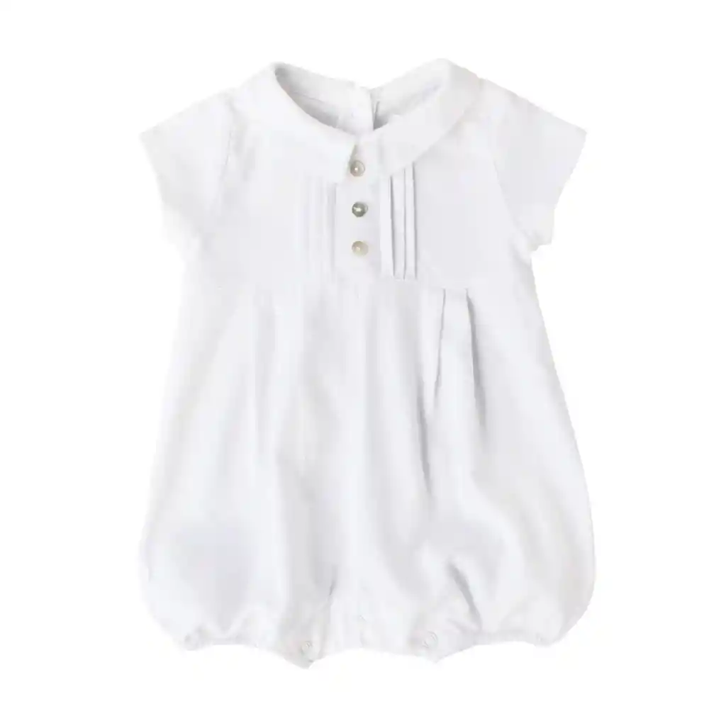 Elegante y fresco bombacho confeccionado en suave lino blanco, ideal para ocasiones especiales o días de verano. Su diseño clásico con cuello bebé, botones decorativos y fruncido inferior aporta un toque tradicional y encantador. Perfecto para mantener la comodidad y el estilo de tu pequeño. - Lavar con agua fria. - No usar Secadora