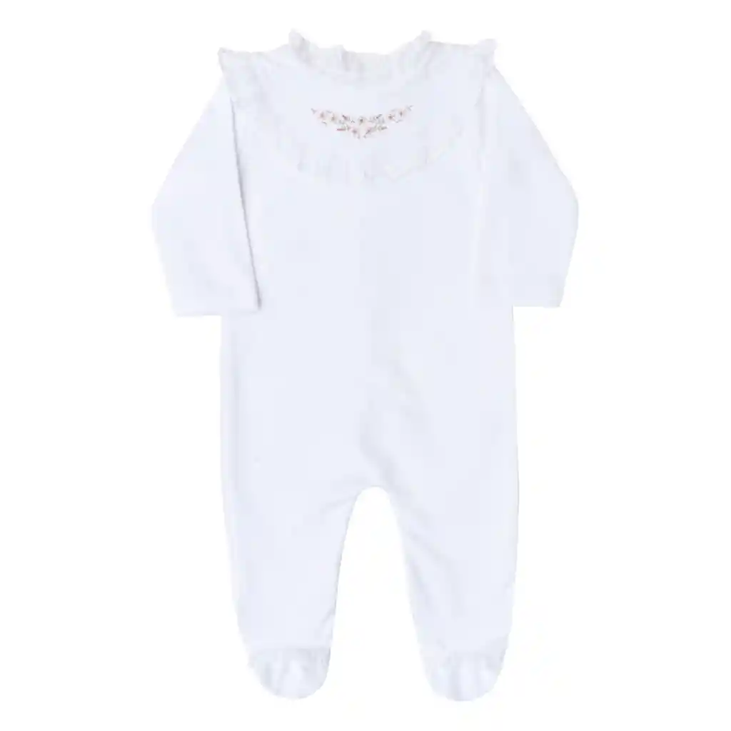 Nuestro delicado enterito Emilia está hecho en 100% Algodón Pima. La fibra más delicada para la piel suave y sensible de tu bebé. -Delicado bordado rosa. - Detalle de tira bobos en nanzú de algodón. - 100% Hipoalergénico. - Broches Libres de Níquel. - Lavar a mano con agua fría