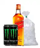 Whisky Johnnie Walker 1 litro acompañado de hielo y 2 Monster Energy