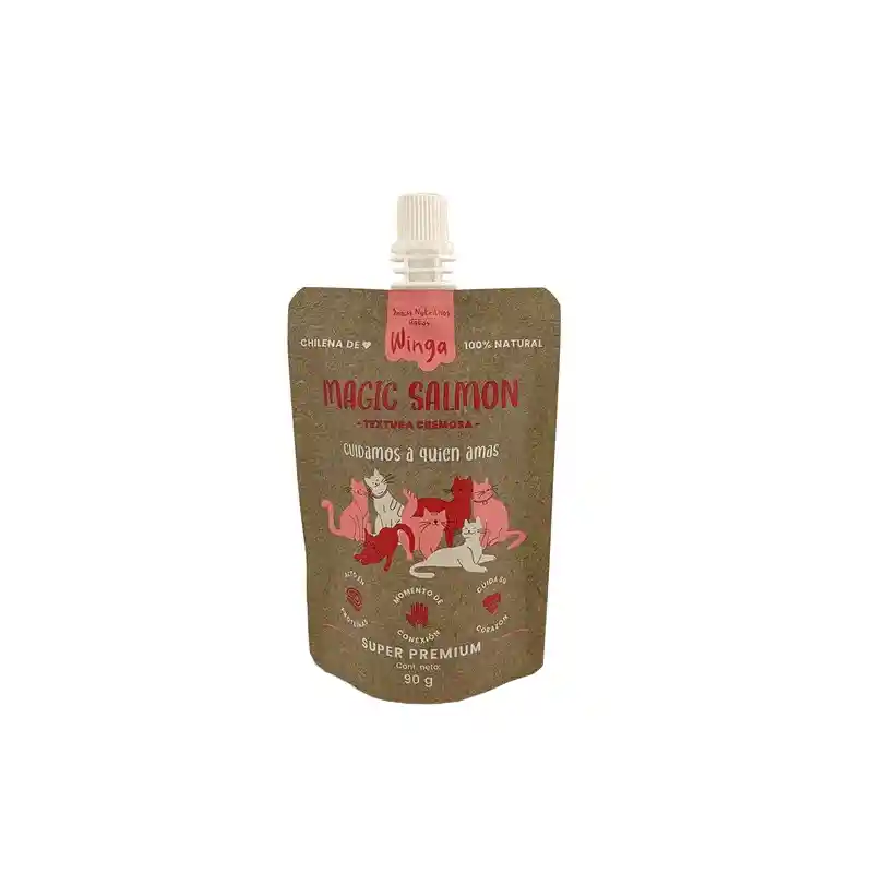Winga Magic Salmon Gato 90gr Display Pouch de salmón para gatos con textura suave y untable, ideal para consumo directo de la boquilla. Características: ALTO EN PROTEÍNAS DE PRIMERA CALIDAD NO POSEE CEREALES, SOYA, MAÍZ, TRIGO, GLUTEN U OTROS INGREDIENTES CON POTENCIAL INFLAMATORIO O ALERGÉNICO. LA TAURINA ES UN AMINOÁCIDO ESENCIAL PARA PREVENIR PATOLOGÍAS CARDÍACAS. Ingredientes: Agua Carne de salmón Carne de pollo Brócoli Zanahoria Almidón de papa (2%) Saborizante natural de hígado de cerdo Goma guar (fibra vegetal) Taurina (aminoácido) Función: Una deliciosa combinación de salmón y pollo que, además, cuida la salud cardíaca de tu gato gracias a la taurina. Contenido: 90 g