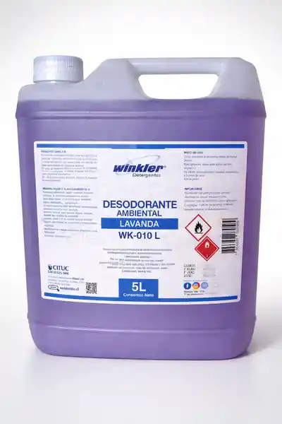 Elimina Eficazmente Los Malos Olores y Refresca el Ambiente Con el Desodorante Ambiental Lavanda de 5 L de la Marca Winkler. Su Fórmula Concentrada de Larga Duración es Ideal Para Mantener Espacios Limpios y Agradables en Entornos Industriales y Comerciales. Aroma Fresco y Duradero Para un Ambiente Más Agradable!.