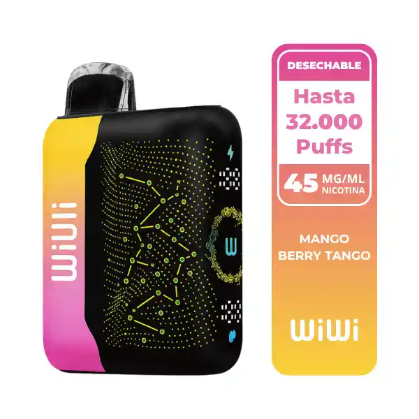 El WiWi Plus Mango Berry Tango 32 000 Puffs fusiona mango tropical jugoso con frutos rojos intensos. Con 4,5 % de sales de nicotina, batería recargable USB-C y pantalla LED, ofrece hasta 32 000 caladas de sabor frutal vibrante y refrescante.