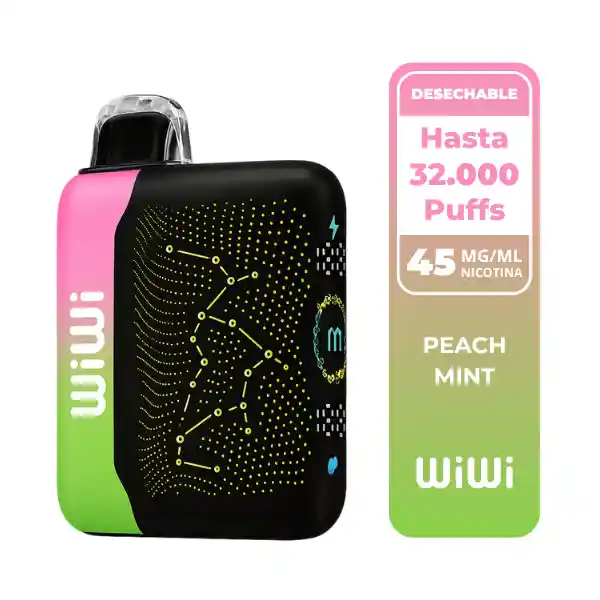 El WiWi Plus Peach Mint 32 000 Puffs combina la dulzura del durazno maduro con un toque de menta suave y refrescante. Con 4,5 % de sales de nicotina, batería recargable USB-C y pantalla LED, ofrece hasta 32 000 caladas de sabor frutal, fresco y equilibrado.