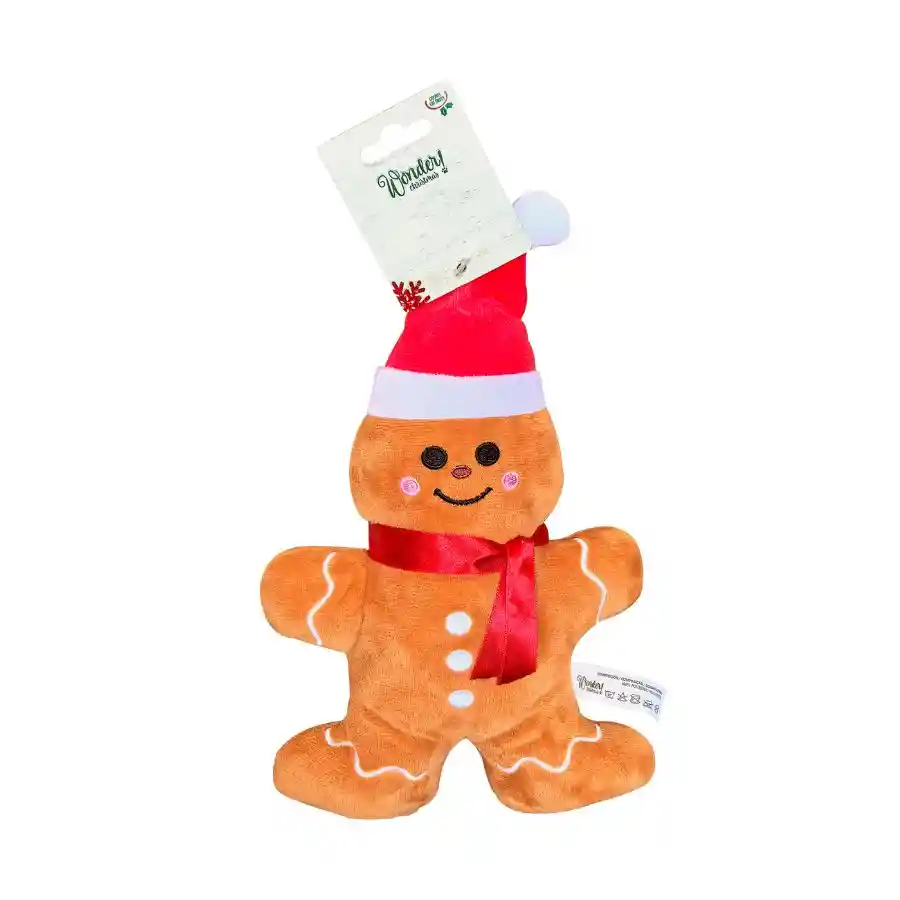 Peluche navideño con forma de galleta de jengibre, suave y liviano. Ideal para decorar, regalar o acompañar a tu mascota en casa durante las fiestas.