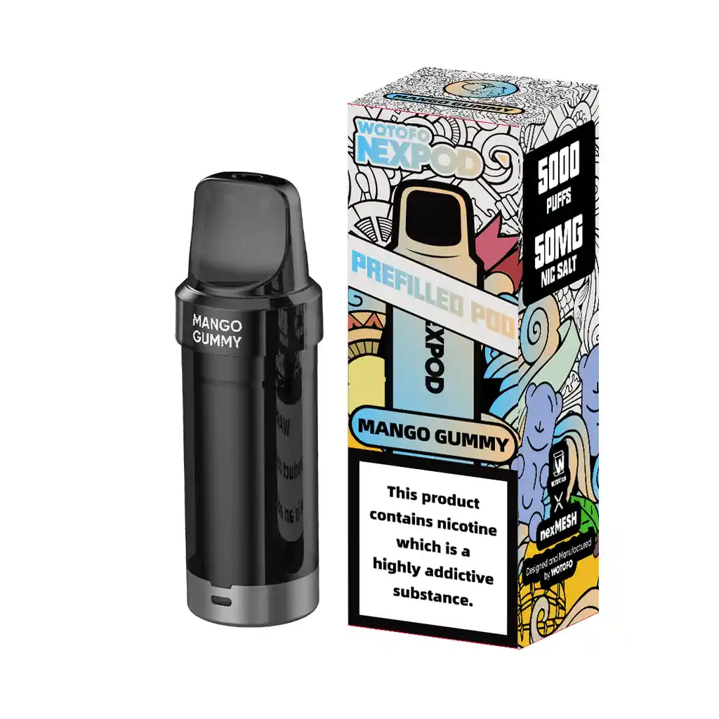Sabor: Gomitas de Mango POD pre-cargado compatible con sistemas NexPod. Capacidad 10 ml equivalente a 5000 puffs. Potencia 4,5% Este producto requiere de una bateria Wotofo NexPod