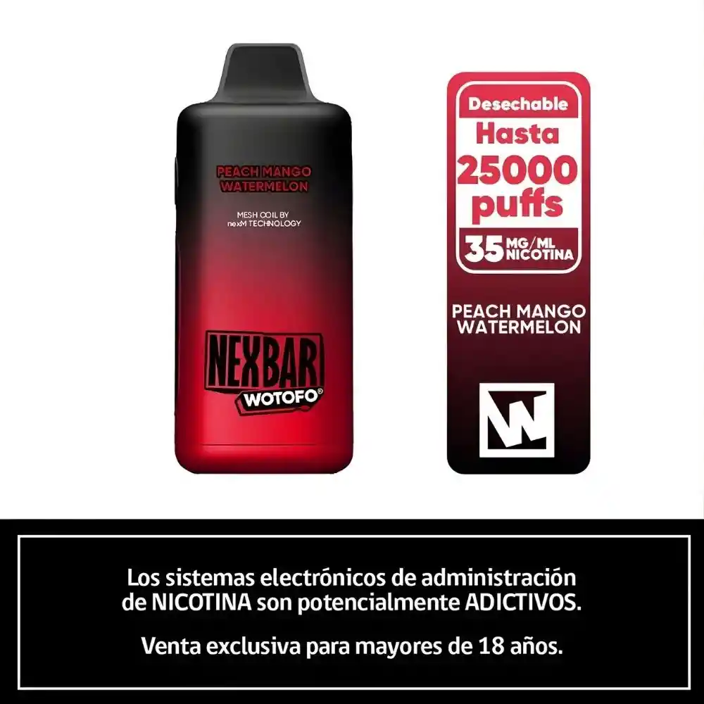 Wotofo Nexbar 25K Peach Mango Watermelon combina tres frutas en un perfil tropical equilibrado. La durazno aporta suavidad y dulzor aterciopelado, el mango suma intensidad exótica y cuerpo, mientras que la sandía entrega un matiz jugoso y refrescante que redondea la mezcla. El resultado es un sabor frutal amplio, dulce pero balanceado, con una sensación ligera y fresca al final que evita la saturación.