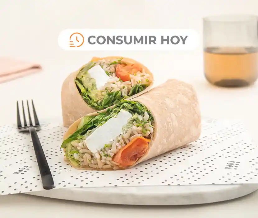 Wrap relleno de queso fresco, arroz integral, tomates asados y lechuga.