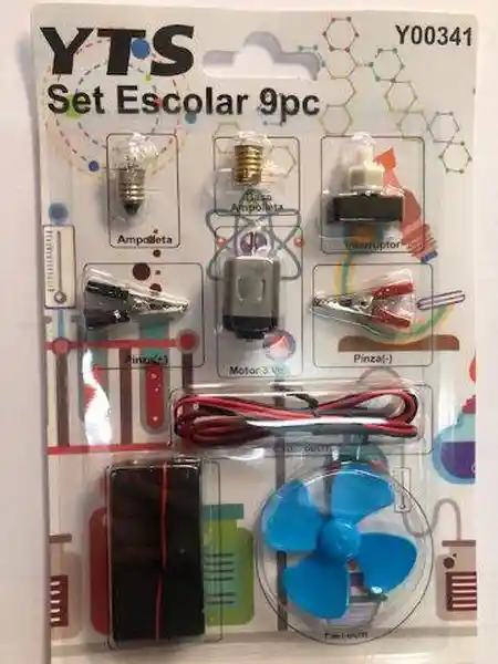 Contiene 9 Unidades. Circuito Eléctrico Ideal Para Trabajos Escolares Contiene: 1 Ampolleta 1 Base 1 Interruptor 1 Porta Pila AA 1 Cable de 80 cm 2 Pinzas 1 Motor 1 Hélice.