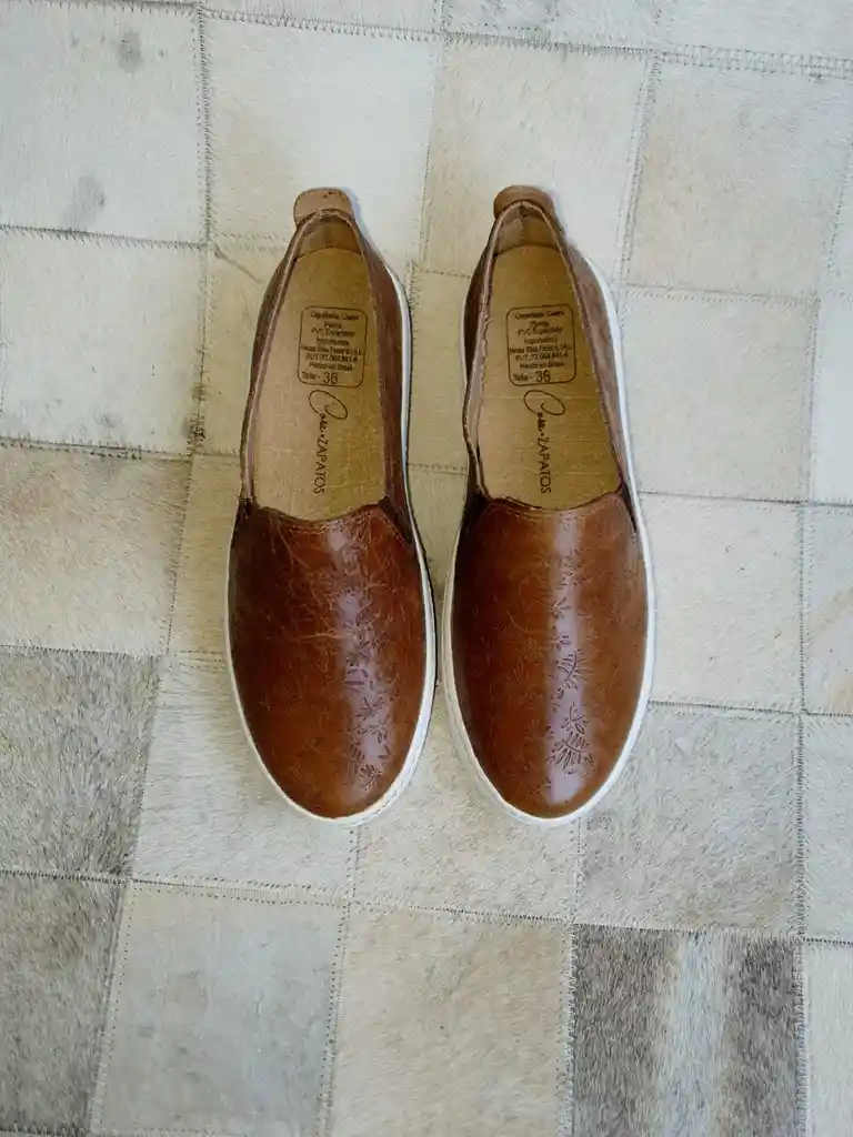 Zapatilla cuero vaca color camel con dibujo a láser. Tipo alpargata. Súper cómoda. Largo del pie: 24 a 24,6 cm