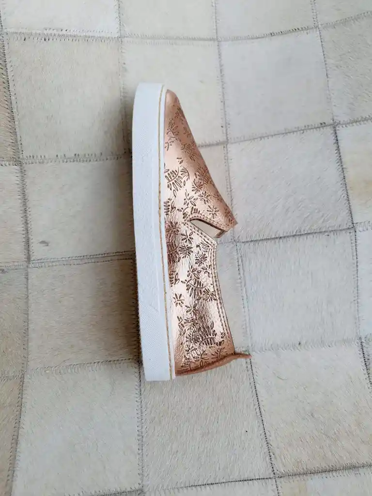 Zapatilla cuero vaca color cobre con dibujo a láser. Tipo alpargata. Súper cómoda. Largo del pie: 26 a 26,5 cm