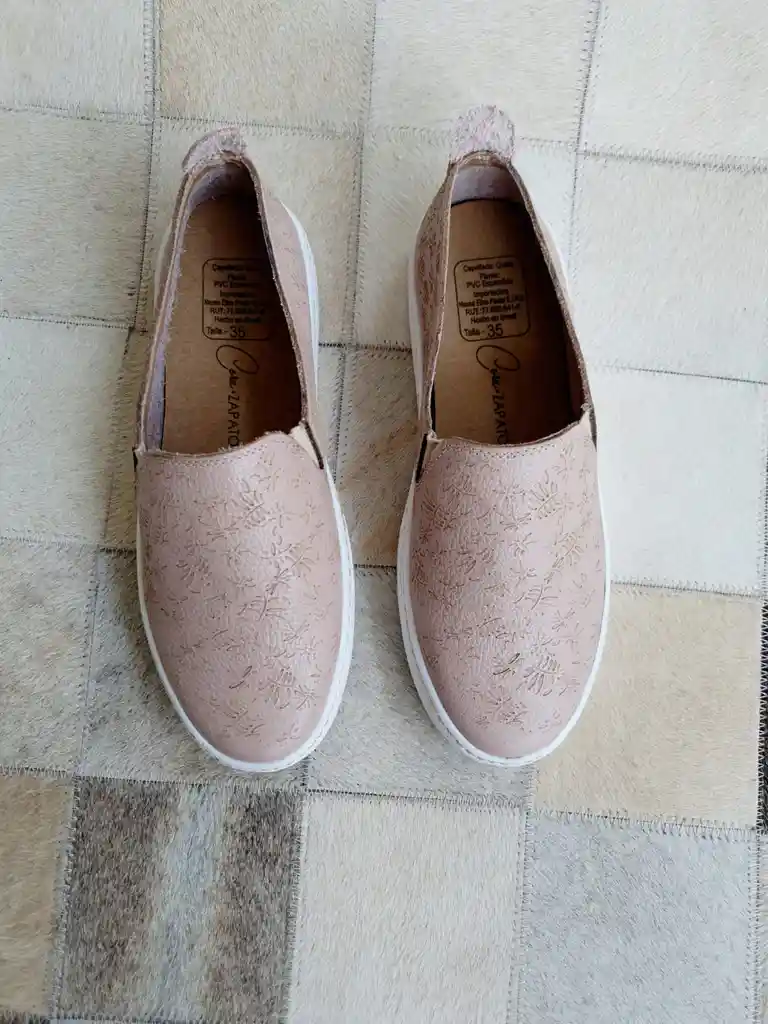 Zapatilla cuero vaca color rosa palo con dibujo a láser. Tipo alpargata. Súper cómoda. Largo del pie: 26 a 26,5