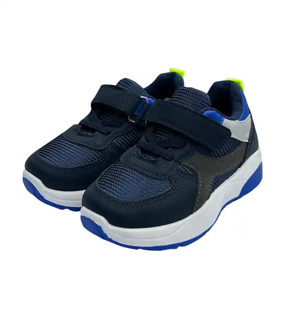 Cómodas Zapatilla para niño. Con Cordones y velcro ajustables para facilitar el colocar y sacar. Color Azul con detalles blanco y negro. Excelente Calidad.