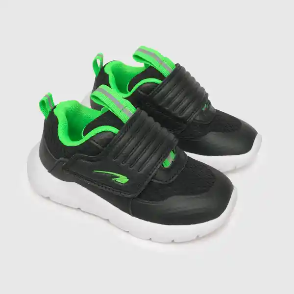 Par. De Niño Deportiva Negra. Fabricada Con Materiales de Calidad Especialmente Elegidos Para Mantener la Temperatura Adecuada Del Pie. -Capellada 45% Sintético 55% Textil. -Forro 100% Textil. -Plantilla 100% Textil Antibacterial Con Medidor de Talla Que Otorga Control Para un Calce Perfecto. -Suela 100% Phylon Liviana y Flexible. -Tipo de Cierre: Velcro -Altura Caña: Baja.