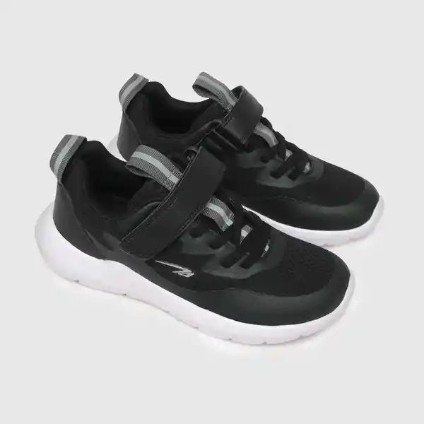 Par. De Niño Deportiva Negra. Fabricada Con Materiales de Calidad Especialmente Elegidos Para Mantener la Temperatura Adecuada Del Pie. -Capellada 20% Sintético 80% Textil. -Forro 100% Textil. -Plantilla 100% Textil Antibacterial Con Medidor de Talla Que Otorga Control Para un Calce Perfecto. -Suela 100% Phylon Liviana y Flexible. -Tipo de Cierre: Velcro-Cordón Elástico -Altura Caña: Baja.