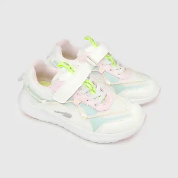 Par. De Niña Deportiva Reciclada Blanca. Fabricada Con Materiales de Calidad Especialmente Elegidos Para Mantener la Temperatura Adecuada Del Pie. -Capellada 40% Sintético 60% Textil. -Forro 100% Textil. -Plantilla 100% Textil Antibacterial Con Medidor de Talla Que Otorga Control Para un Calce Perfecto. -Suela 10% Tr 10% Tpu 80% Phylon Liviana y Flexible Con Perfecta Adherencia a Toda Clase de Superficies. -Tipo de Cierre: Velcro-Cordón Elástico -Altura Caña: Baja.