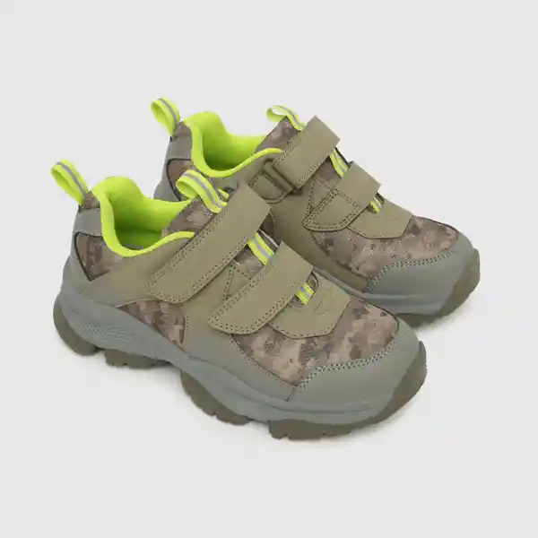 Par. De Niño Outdoor Estampada Verde. Fabricada Con Materiales de Calidad Especialmente Elegidos Para Mantener la Temperatura Adecuada Del Pie. -Capellada 70% Sintético 30% Textil. -Forro 100% Textil. -Plantilla 100% Textil Antibacterial Con Medidor de Talla Que Otorga Control Para un Calce Perfecto. -Suela 100% Tr Con Perfecta Adherencia a Toda Clase de Superficies. -Tipo de Cierre: Velcro -Altura Caña: Baja.