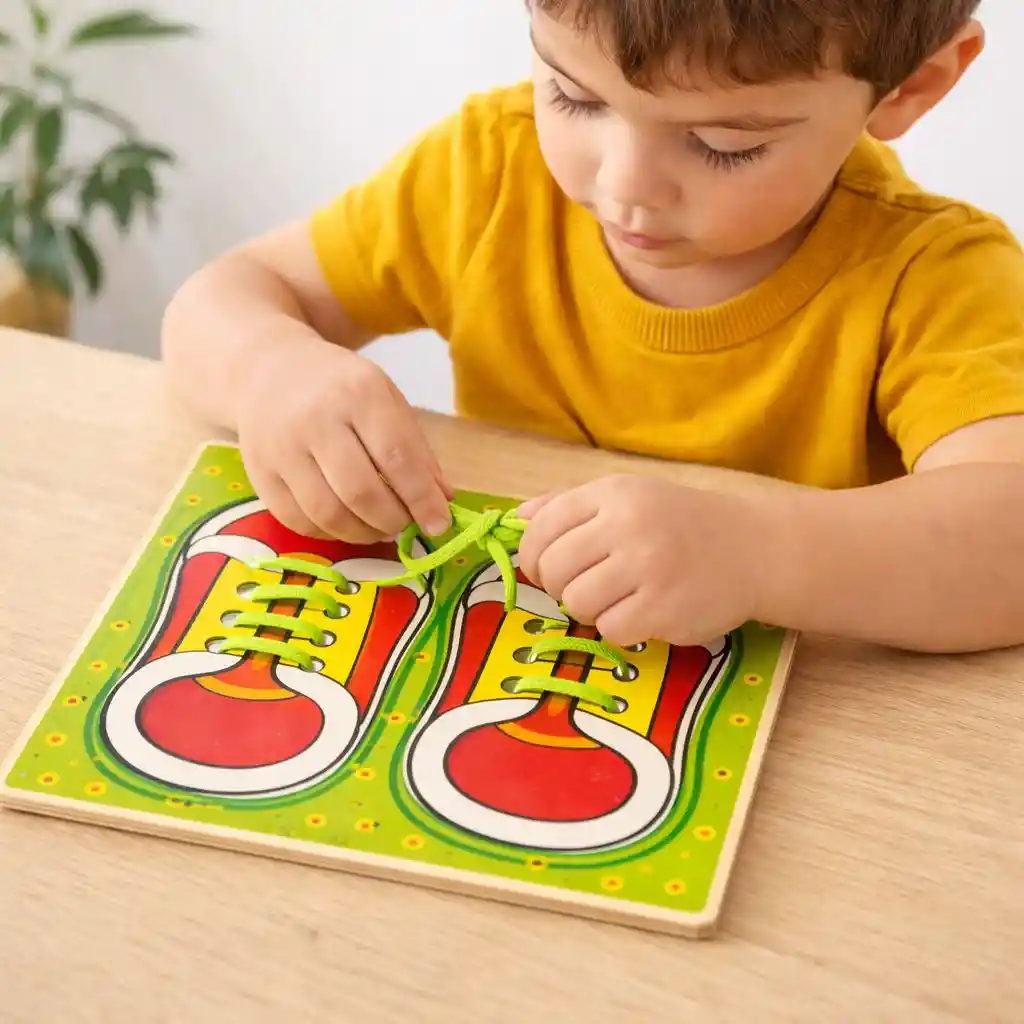 Este práctico y entretenido juguete educativo está diseñado para ayudar a los niños a aprender a amarrar cordones de forma fácil y divertida. Con forma de zapato y fabricado en madera resistente, permite practicar una habilidad esencial para la vida diaria mientras se desarrollan capacidades motoras. Ideal para el aprendizaje temprano bajo metodología Montessori, fomenta la autonomía, la coordinación y la concentración en los más pequeños.