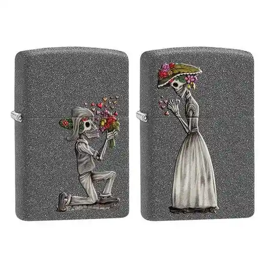 Set de 2 Encendedores Zippo Originales en Metal Gris Con Efecto Piedra y Diseño de Pareja Impreso Inspirado en el Día de Muertos. Tamaño de Encendedor Estandar y Mechero Con Diseño Tipo Chimenea a Prueba de Viento. Para un Máximo Rendimiento Utilízalo Con Los Suministros Zippo Genuinos: Bencina Mecha y Piedra. Los Encendedores Vienen Sin Llenar. Utilice el Líquido Combustible de Encendedor Marca Zippo 57 x 38 cm