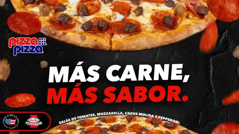Pizza todas las carnes ( base de salsa y queso mozzarella + choricillo, jamón, pepperoni y carne molida ) + y bebida de 1.5lt a elección.